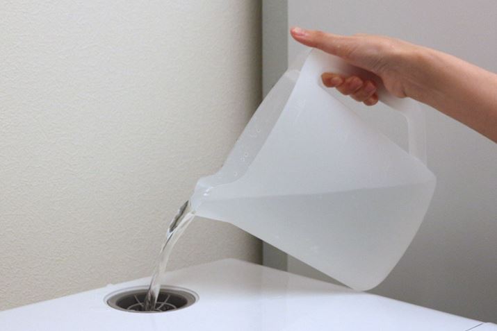 食器をセットしてモードを選んだら、給水カップ約3杯分、5L分の水を注ぎます。タンクが満水になるとブザーで知らせ、液晶の「給水アイコン」が消えます。
