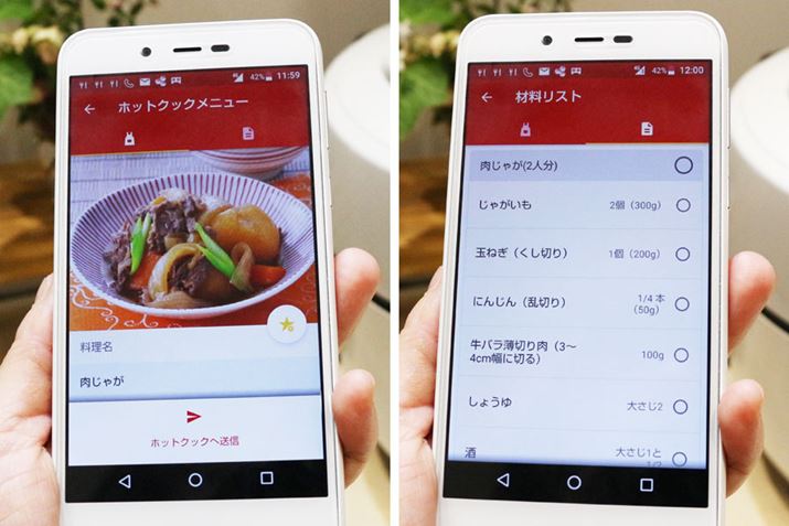 スマートフォンで、クラウドサービス「COCORO KITCHEN」にあるメニューを検索し、作りたいメニューを本体に送信すれば自動調理が可能に。必要な材料をチェックすることもできるので帰宅時に効率よく買い物を済ますこともできます