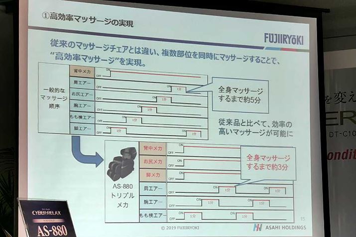 “高効率マッサージ”により、一般的なマッサージチェアでは5分かかっていた全身のマッサージが3分で完了するようになるということです