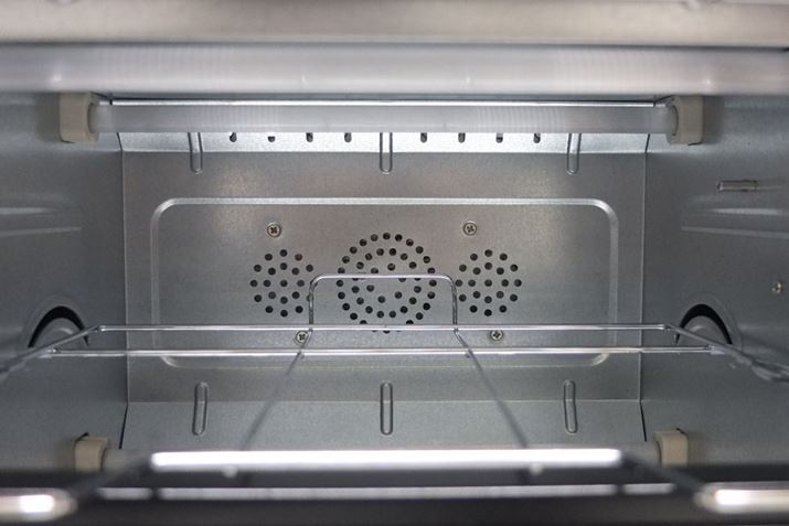 庫内奥の穴の奥にファンを配置。ここからの風で熱風を循環させて食材をムラなく加熱します。庫内右側上部にある細長い突起は温度センサーで、これで庫内の温度をチェック、サーモスタットによるON/OFF切替で温度を細かく制御します