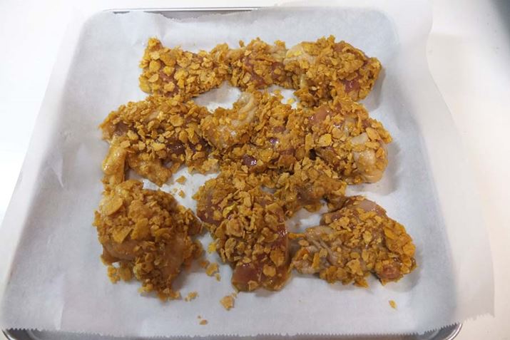 鶏肉に調味料と卵、薄力粉をもみ込み、コーンフレークの衣を付けて、クッキングシートを敷いた天板に並べます