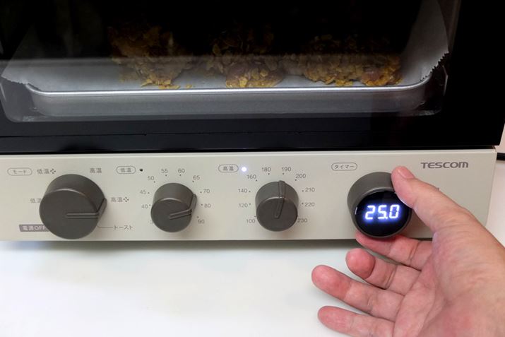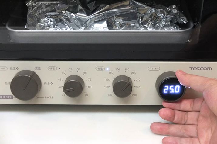 ちなみに、運転開始後に時間設定ダイヤルを回しても、加熱時間を変更できるようです。その際、「高温/高温コンベクション」モードでは時間を短くすることも長くすることもできますが、「低温/低温コンベクション」モードの場合は時間を短くすることしかできないのが、若干不便に感じました。
