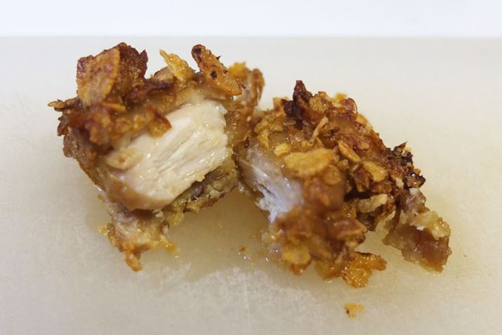 完成した唐揚げを包丁でカット。1番厚みのある唐揚げを切りましたが、火の通りは問題なしでした。コーンフレークも一度卵を吸ってから熱風加熱されているので、クリスピー感がより増しています