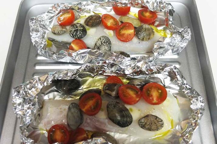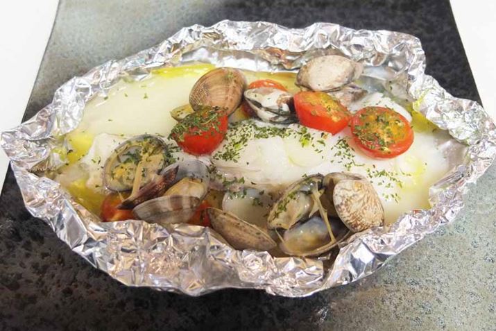 アルミホイルに塩を振った白身魚のタラ、ミニトマト、あさり、ニンニクを乗せ、汁がこぼれないようにアルミホイルの端を皿型に折り畳み、白ワインとオリーブオイルを振ります