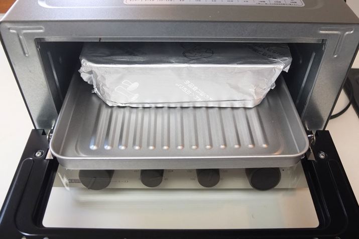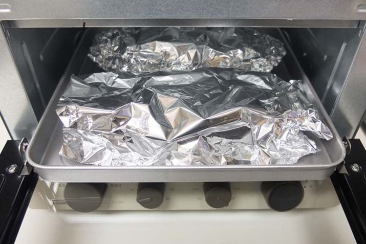 天板にアルミホイルを並べ、さらにアルミホイルでふたをしてオーブンへ。「高温」モードの温度は200℃、加熱時間25分に設定しました