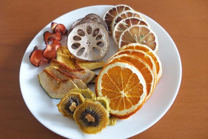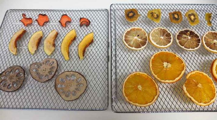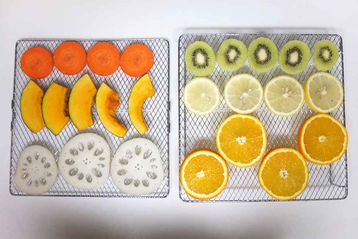 続いて、これもこの製品の“推し”の機能である「フードドライ」を試してみました。フルーツはネーブルオレンジ、レモン、キウイをスライス、野菜はかぼちゃとにんじん、レンコンをスライスしてドライフルーツ・ドライベジタブル作りに挑戦です。