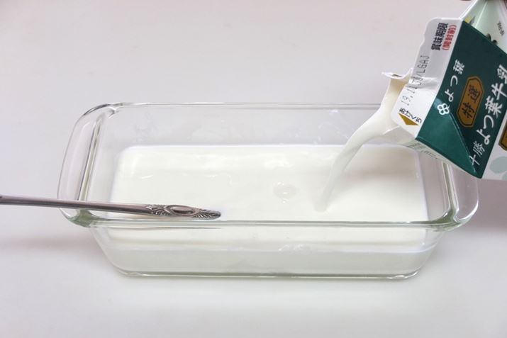 熱湯消毒した耐熱容器に500mlの牛乳と50gのヨーグルトを入れてよく混ぜます。ここまでの手順はヨーグルトメーカーを使用する時と同様