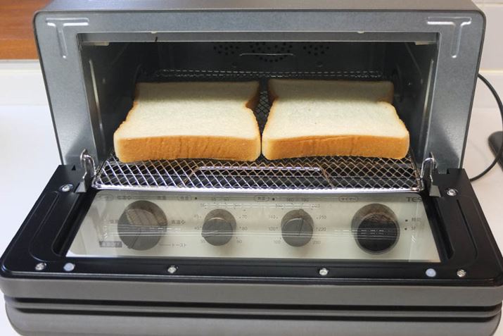 最後に、普段もっとも使うことになるだろう「トーストモード」を試してみました。庫内には最大4枚の食パンが入り、大人数世帯にも対応できそう。今回は6枚切りの食パンを2枚焼いて、食感を見てみました。