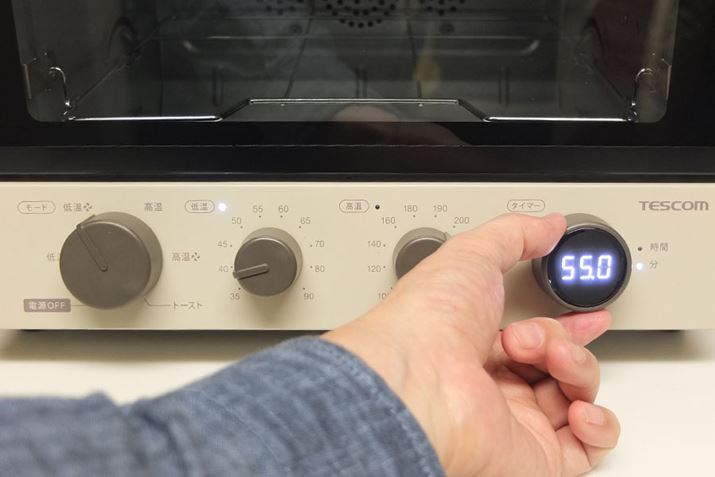 加熱時間設定用のダイヤルは設定時間が液晶表示されるタイプで、「低温/低温コンベクション」モードでは5分刻み(1時間以降は30分刻み)で設定時間を変えられます