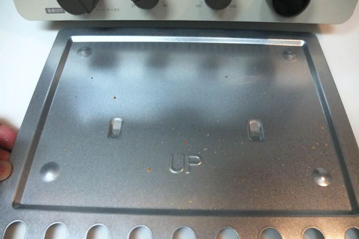 庫内底部はオーブントースターと同様に、外から取り外せるようになっています。パンくずなどが落ちたまま長く放置すると焦げ付いてしまうので、定期的に掃除したほうがいいです