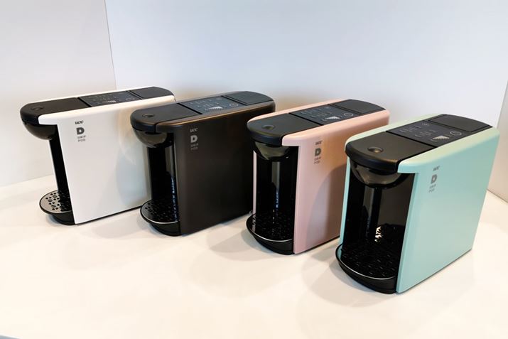 左から、ホワイト、ブラウン、アッシュピンク、ペールミントの4色展開。サイズは133(幅)×224(高さ)×290(奥行)mm、重量は約3kg。電源コードの長さは1m。幅と高さが抑えられているので、ほかのカプセル式コーヒーメーカーに比べてコンパクトな印象を受けました