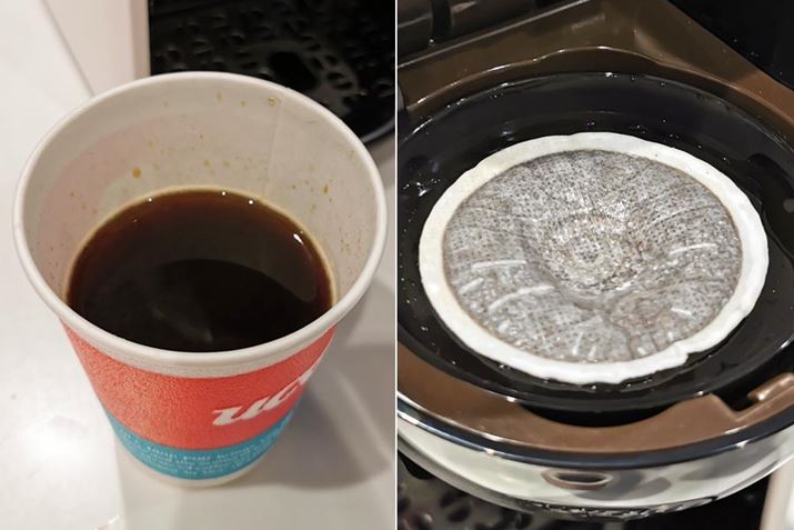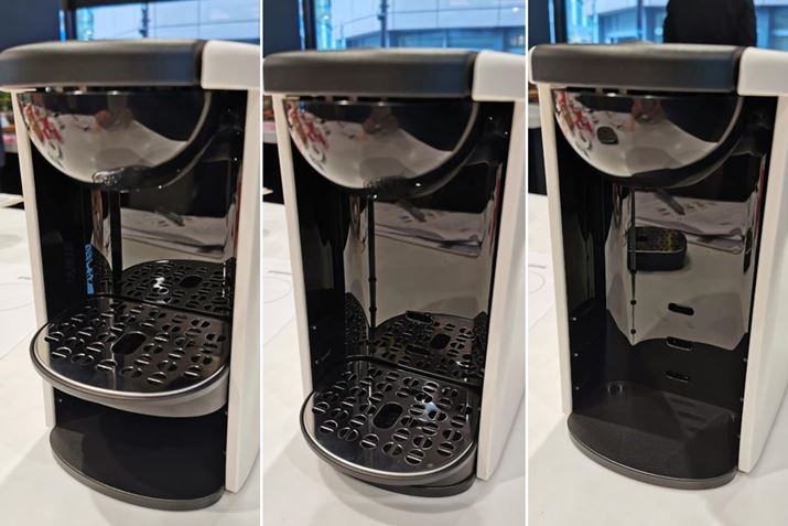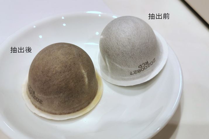 30秒ほどで抽出完了(左)。抽出後のカプセルはふっくらとふくらんでおり、コーヒー粉がしっかりと蒸らされていることがわかります(右)