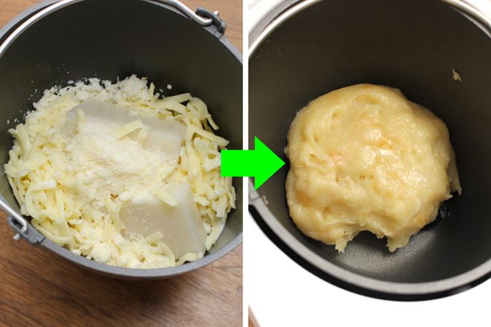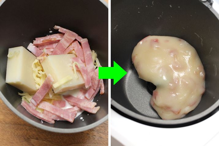 切り餅2個・ベーコン・ピザ用チーズ・牛乳・塩をすべてねり容器に入れて、「アレンジ1」で調理。25分後、かなりモチモチなモノができあがりました