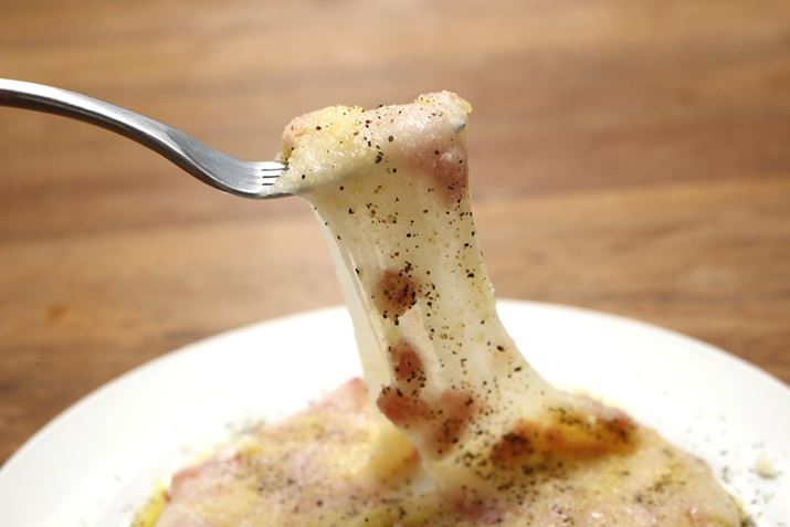 見てください、このモチモチ感! ベーコンの形もちゃんと残っており、食感にアクセントがあって飽きません。ベーコンとチーズのコクにオリーブオイルが香ばしくからんで、オシャレ味のお餅といった感じに