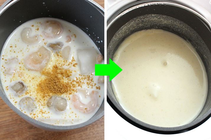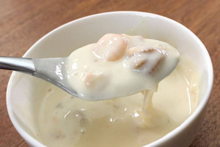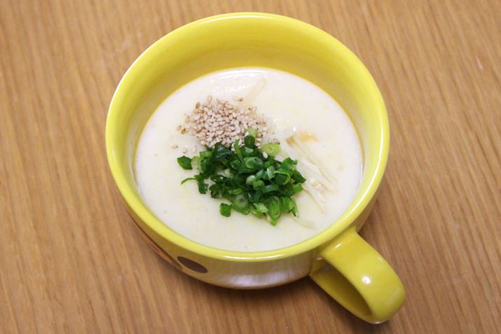 材料は、切り餅1個・絹ごし豆腐・鶏ガラスープの素(粉末)・牛乳・塩。お餅はかくはんされて、完全に牛乳に溶け込んでいる状態。食感は「トロサラ」です