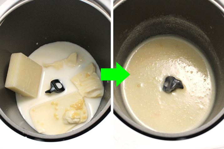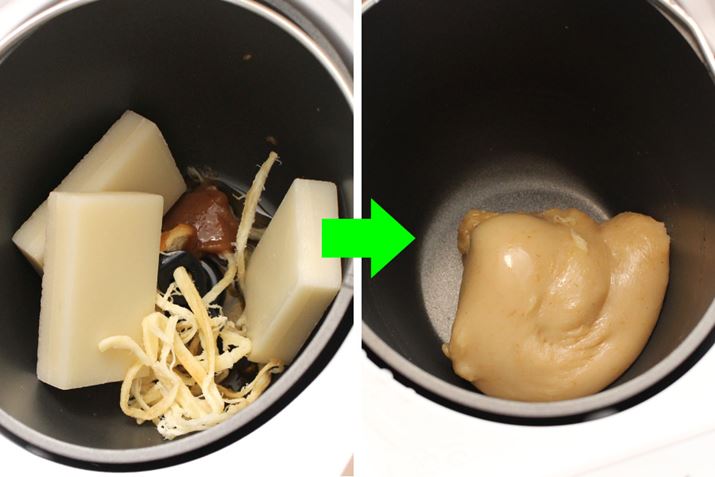 次に、もちブレンダーで作るスープ系のメニューを2品ご紹介しましょう。いずれも、牛乳など水分になる材料を多く入れるレシピで、モチモチ感の残った汁物を作ることができます。お餅が汁に溶け込んでトロトロに混ざるのがポイント。お年寄りや小さな子どもにちょうどいいですし、風邪をひいたときにもピッタリだと思いました。このように水分量の多い調理は「アレンジ2」(調理時間約35分)を選択して作ります。