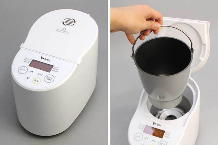 本体サイズは190(幅)×220(高さ)×300(奥行)mm、重量は約3.3Kg。安全装置として、温度ヒューズ・電流ヒューズ・モーター保護装置を装備しています。ねり容器、計量カップのほか、取扱説明書と専用レシピ集も同梱