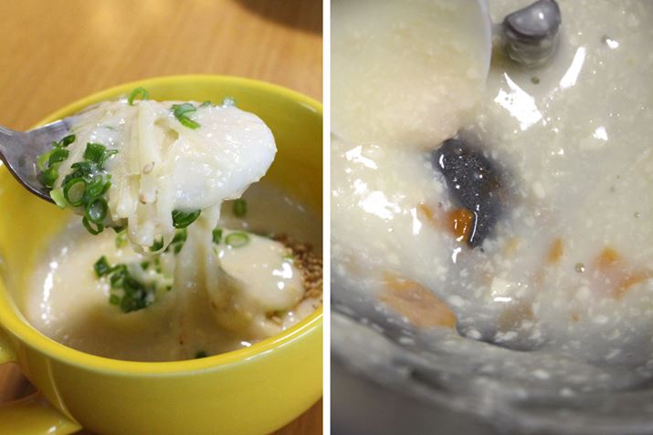 続いては、「お豆腐ミルクもち粥」。こちらは、切り餅のほかに豆腐や鶏ガラスープ・牛乳を入れ、「アレンジ1」のほうを選択して作ります。完成したお粥は、上述のクラムチャウダーよりやや水分が多めのできあがりに。牛乳・お餅・豆腐が混ざり合って、食感は「トロサラ」って感じです。ここに、ゴマ・ネギ・ショウガなどを散らしてフィニッシュ。鶏ガラスープの素の代わりにコンソメを入れたり、トマト缶をプラスしたりすれば洋風にもアレンジできそう。