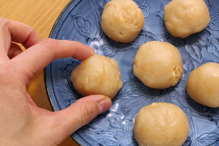 完成品をひと口サイズに丸めてお餅ボールに。さきいかはところどころ原型を残しつつも、混ざり込んでいる感じ