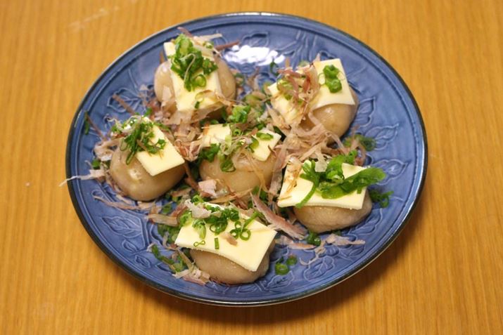 続いては、その名の通りお酒と合いそうな「おつまみイカもち」。材料は切り餅のほか、さきいかや梅肉、めんつゆなどを入れて作ります。完成品は普通のつきたてのお餅くらいにモチモチ感があり、ひと口サイズに丸めると、味付けのお餅ボールができあがる感じ。最後にチーズ・ネギ・かつおぶしをかけて食べるのですが、ネギがよく合っていて、梅肉の酸味がほんのり香るのがオツ! 晩酌のお供にピッタリです。