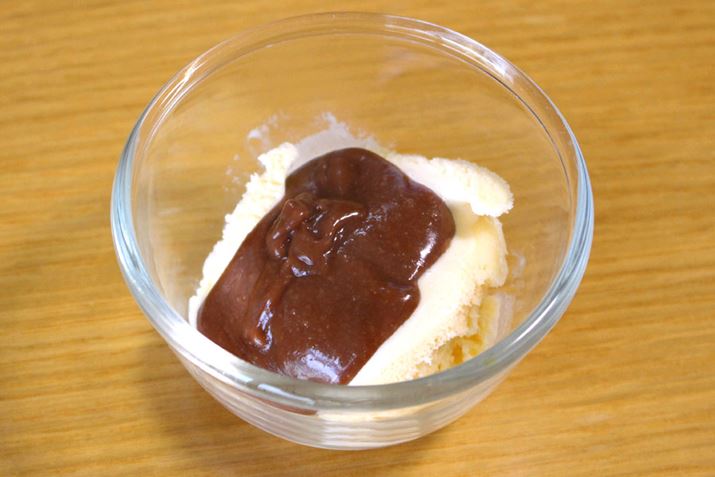 アイスクリームにかけてみました。チョコレートソースなのですが、お餅が練り込まれているのでアイスに溶けず、ずっとチョコレートとしての本体を保っています。食べてみると、アイスとからむモチモチの食感がおいしい! しかしこれ、どこかで体験したことがあるな……と思ったら「雪見だいふく」でした! 口に入れると、完全に雪見だいふくの食感です