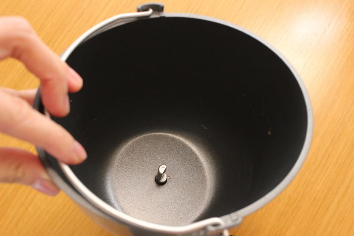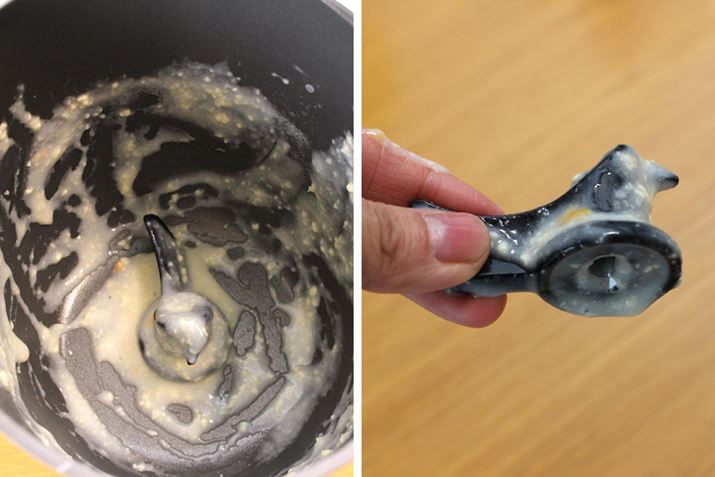 レシピによりけりですが、写真のように水分量の多い調理の後はこびりつきが発生します。ひとまずねり容器と羽根を少し水につけておいたあと、家庭用中性洗剤で洗えばOK。羽根の奥まで入った汚れはつまようじなどで取りましょう