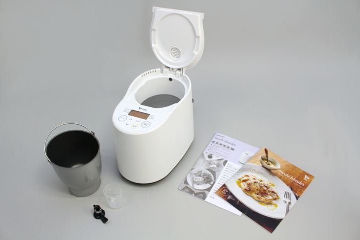 エムケー精工は、40年以上にわたって「餅つき機」の開発を行ってきたメーカー。そんな同社が、餅から料理を作れるようにと開発したのが、このもちブレンダーです。外観・仕様・付属パーツについては、以下の写真をご覧ください。というか、普通に餅つき機能も付いているので、「餅つき機に調理機能が加わったもの」と言ったほうがわかりやすいかも。