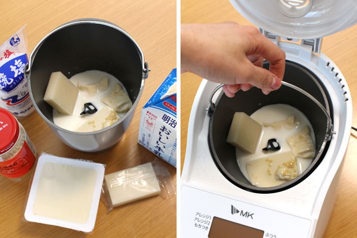 【ステップ1】切り餅(または丸餅)と材料をねり容器に一気に入れて、それを本体にセット。材料は本当にただポンポン入れるだけで、自分で混ぜる必要などは一切ありません