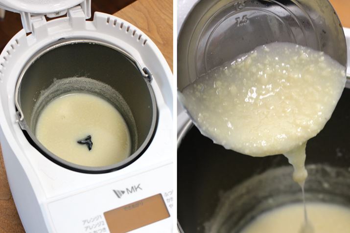 まず、完成したお餅料理をお皿に取り出すときに、ヤケドをしないように気を付けたいということ。もちブレンダーは、お餅と食材を加熱しながらかくはんするので、全メニューともでき上がりがアツアツなんです。特に水分の多いレシピは、モチモチ感が残って粘度のある液体になっているので、取り出しにくいことがあります。