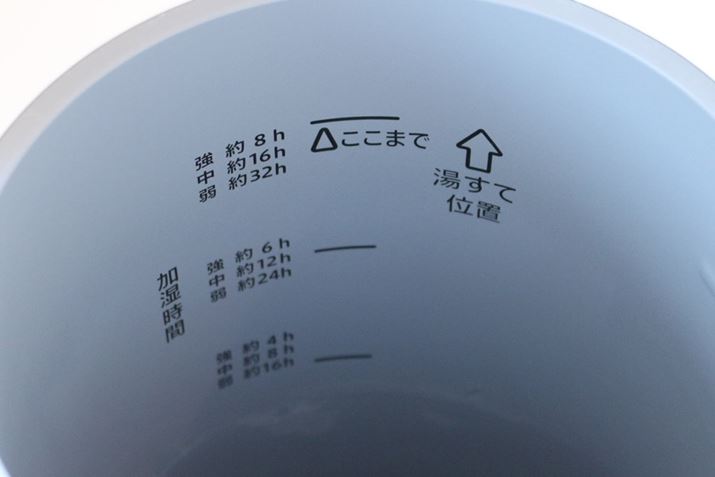 タンクにはフッ素加工の広口容器を採用。運転時間の目安に合わせて給水できる水位線付きで、水を捨てる際の位置も印字されています
