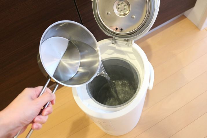 給水口が全開なので、給水はこれ以上ないくらい楽です。ただし、蛇口から直接給水したり、浴室の床などに置いて底面が濡れるのはNGとのことなので、いったん別の容器に汲んで給水する必要があります