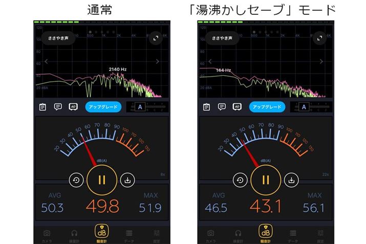 個人的に湯沸かし時の音は特に気になりませんでしたが、「湯沸かしセーブ」モードも試してみました。平均して7dBくらい音が抑えられるようです(本体から10cmほどの位置で測定)