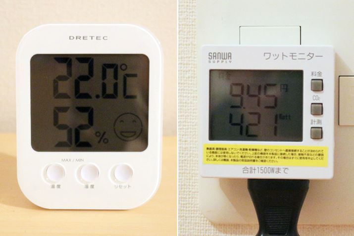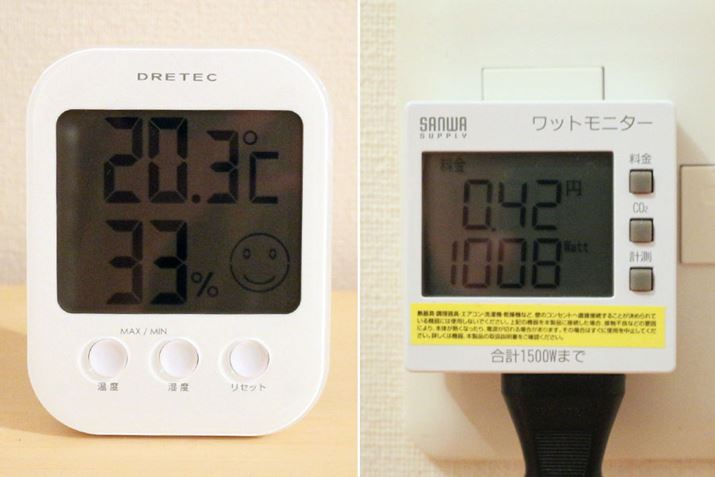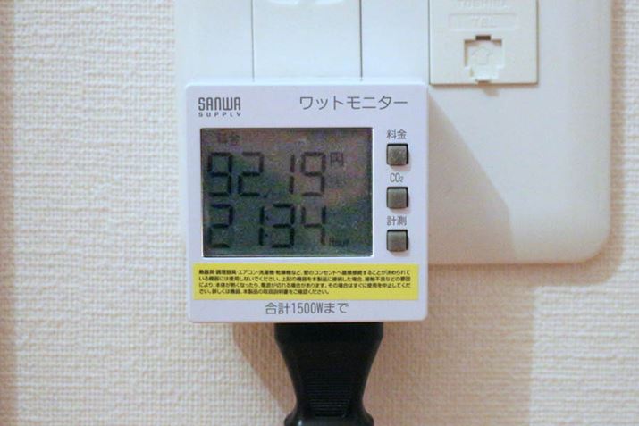 室温約20℃、湿度33%の状態で電源をオン。今回使用したワットモニターの計測では、湯沸かし中は消費電力が1,000Wを超えることもありました