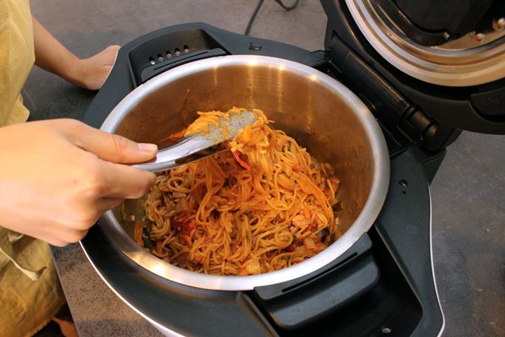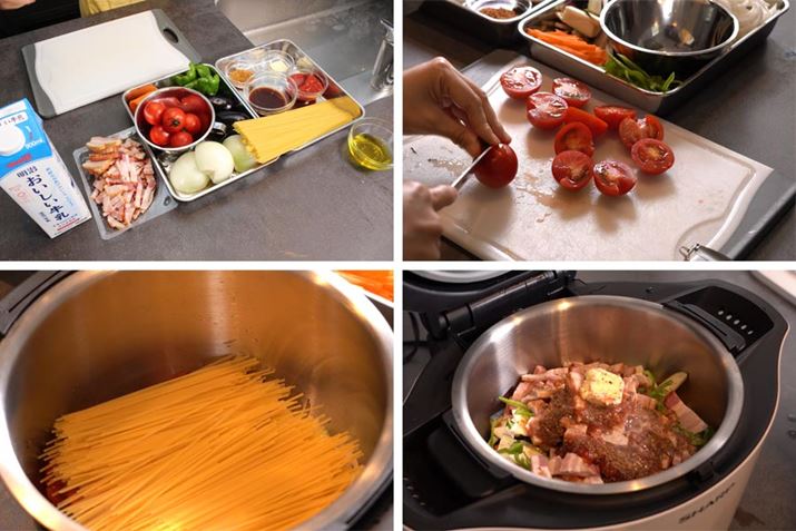 さらに、料理上級者でないと難しいイメージの「無水調理」が自動でできるのもポイントです。そこで今回は、ホットクック公式レシピを参考に、無水で作るパスタ料理にトライ! 食材と一緒にパスタを乾麺のまま入れて、ボタンをポンと押せば、自動で絶品ナポリタンができちゃうんです。