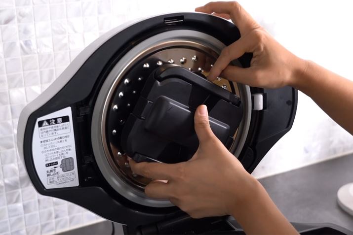 本体のフタに「まぜ技ユニット」を取り付けるのをお忘れなく。調理中に、自動で食材をかき混ぜてくれるパーツです