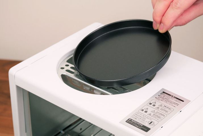 続いて、ホットプレート。トースターのヒーターが本体上部に露出しており、ここにフタをするかたちで円形のホットプレートを置く。トースターのヒーターをホットプレートの熱源としても利用するわけだ。ホットプレートのサイズは、実測値で直径約14cm。卵1個で目玉焼きを作るのにぴったりなサイズである。