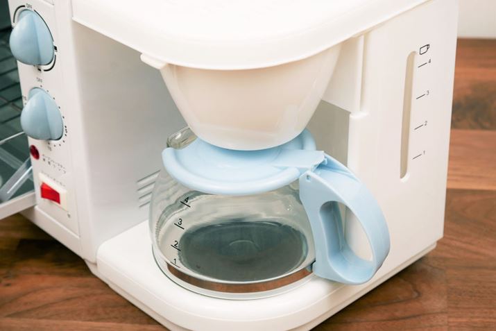 コーヒーメーカーは本体右側に配置されている。洗って繰り返し使えるメッシュフィルターと計量スプーンが同梱されているので、用意するのは中挽きで挽いたコーヒー粉だけでいい。1度に抽出できるコーヒー量は4人分の480ml(4カップ)。ひとり暮らしならおかわりできる容量だ。なお、フィルターは市販のペーパーフィルター(「102」サイズの2〜4人用)も使用できるので、お手入れの手間を少しでも減らしたい人は、ペーパーフィルターを使用するといいだろう。