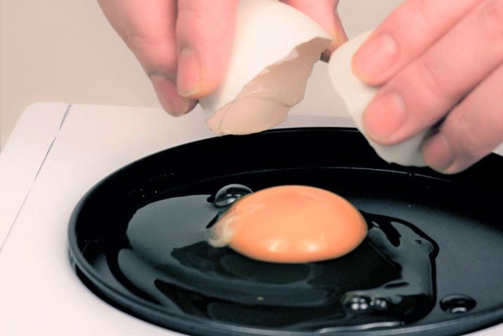 ホットプレートは焦げ付きやすいので、油を引くのを忘れずに。火が通りやすいのは直下にヒーターがある中央部分。真ん中を狙って卵を割り入れる
