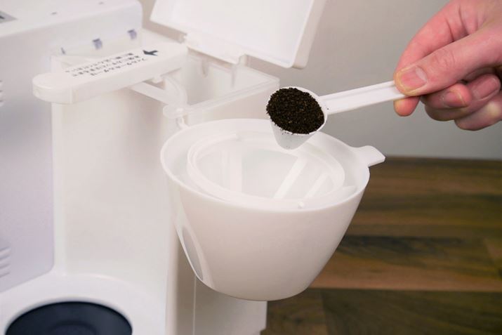 付属のフィルターに中挽きのコーヒー粉を投入。計量スプーンすり切り1杯(約4g)がカップ1杯分(120ml)なのでわかりやすいのだが、一般に、約10gのコーヒー粉がカップ1杯分の目安なので、「ちょっとコーヒー粉が少ないのでは?」と不安に……。ここでは、カップ2杯分を淹れてみることにした