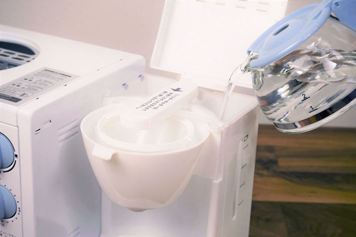 側面の給水目盛りを見ながら、水タンクに水を注ぎ入れる。特に注ぎにくさを感じたわけではないが、給水やお手入れの手軽さを考えると、水タンクが取り外せたらなおよかった