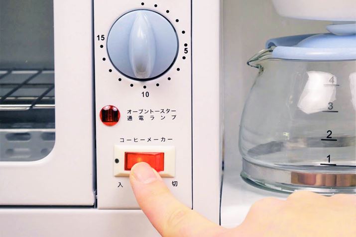 トーストと目玉焼きの焼き上がりを待つ間にコーヒーを淹れよう。バスケットに付属のフィルターをセットして、計量スプーンで中挽きのコーヒー粉を入れる。水タンクにカップ数に応じた量の水を注いで、フタを閉めたらスイッチをオン。約20秒で抽出が始まる。