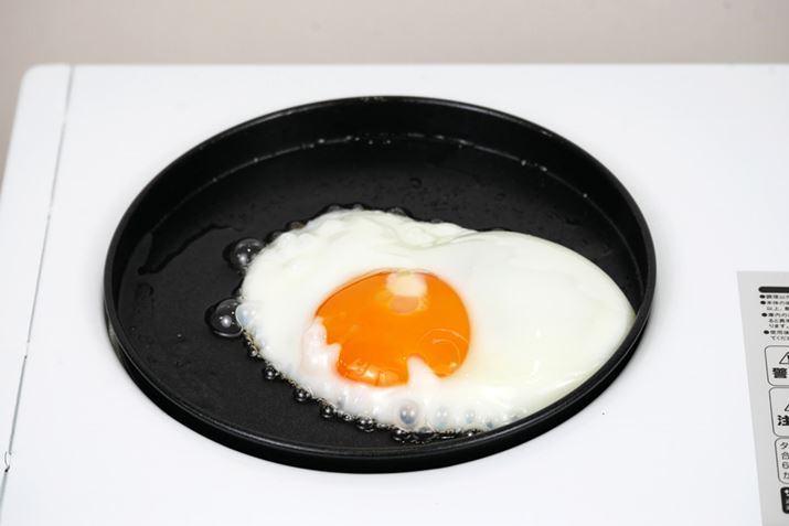 ふたがないので、黄身に火が通りにくい。固めの黄身が好みの人は、サイズの合うふたを用意するか、アルミ箔をかぶせるなどするといいだろう