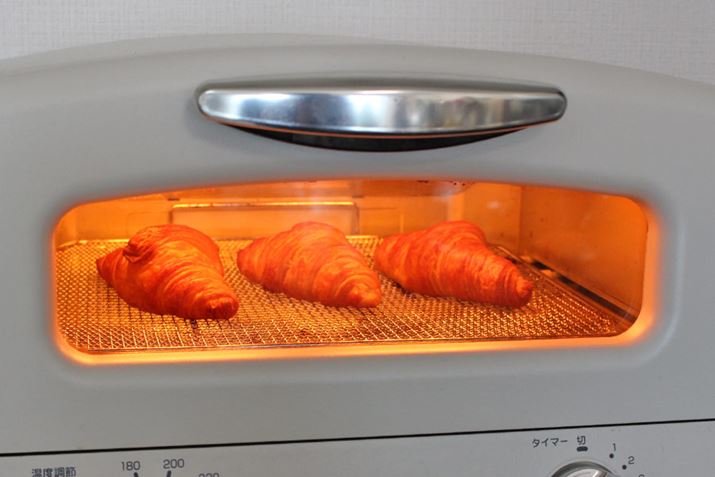 アラジントースターの魅力を語るとき、優秀機能のわりに話題になりにくい気がするのがコレ。クロワッサンやおかずパンなど、「パンの温め=リベイク」ができることです。