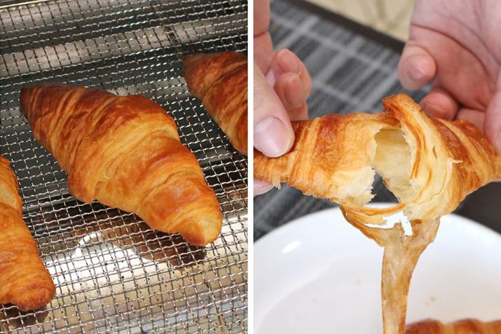 クロワッサンの温め直し。てっぺんが焦げることもなく、ふんわりおいしく仕上がっています。温め直すとバターの香りがよみがえって幸せ