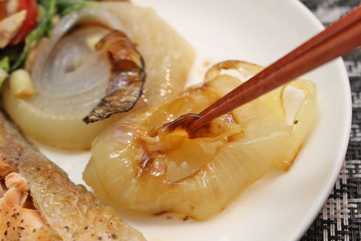 もうひとつ感動するのは、一緒にグリルした備え付けの野菜がおいしいこと! 写真は玉ねぎですが、口の中に入れると甘さと香ばしさがあふれて超美味です。ジャガイモやパプリカなど、いろんな野菜がおいしくなりますよ