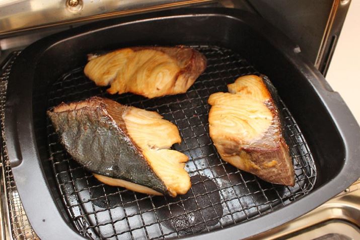 もうひとつ、激推しなのが焼き魚です。我が家で魚を焼くときは、いつもこのグリルパンを使っています。グリルパンの中で熱がしっかり循環するので、魚を途中でひっくり返さなくてもしっかり裏表に火が通り、身もふっくらとおいしく仕上がります。