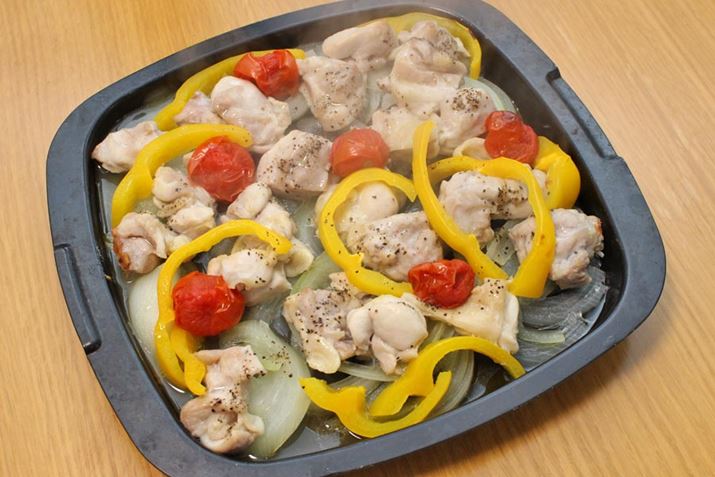 以下の写真は鶏もも肉と野菜のグリルですが、これをアラジントースターで最初に作ってみたとき、「オーブントースターでこんな簡単においしい肉料理が作れるとは!」と驚きました。こちらも材料をグリルパンに入れて加熱するだけのほったらかし料理なので、テレワーク中のお昼ごはんにぴったり。