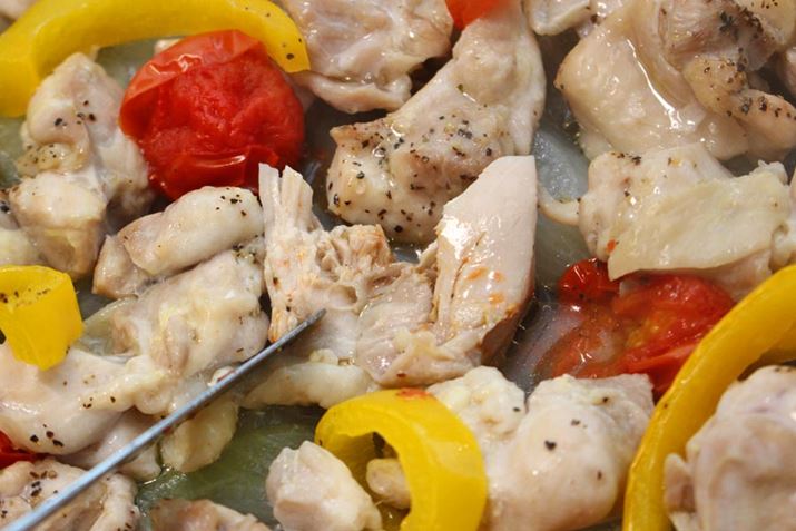 鶏もも肉と野菜のグリル。ありものの野菜を全部ぶち込んで焼くだけでごちそうになります! お肉を割ると肉汁が……このうまみが染みた野菜がまたおいしい