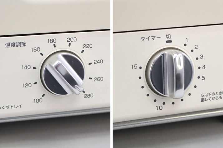 「温度設定」と「タイマー設定」のノブだけを備えるオーソドックスなインターフェイス。多種多様な自動調理メニューを搭載するような、いわゆる高機能オーブントースターではないので、誰でも使い方に迷いません