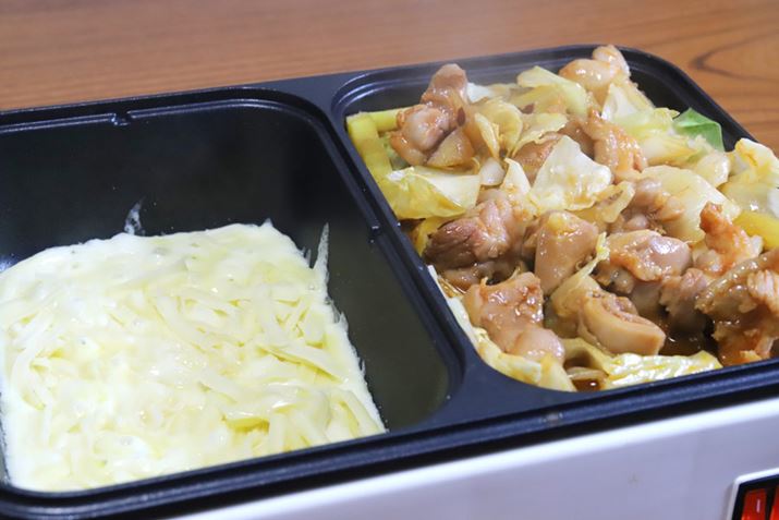 最初に、コチュジャン/醬油/みりんで下味をつけた鶏もも肉と、キャベツ/サツマイモ/タマネギなどの野菜を浅プレートに載せて、フタをしつつ焼いていきます(詳しくはレシピ検索でお願いします)。